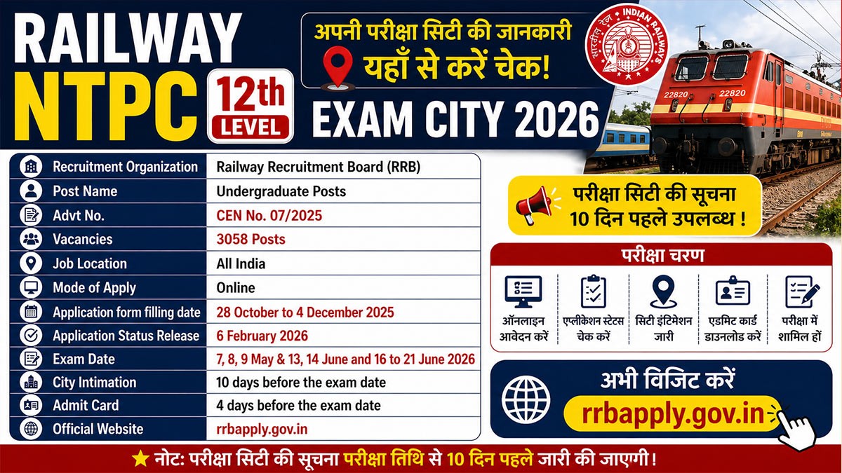 Railway NTPC 12th Level Exam City 2026: रेलवे एनटीपीसी 12th लेवल परीक्षा की एग्जाम सिटी 27 अप्रैल 2026 को जारी कर दी गई है। जिन अभ्यर्थियों ने इस भर्ती के लिए आवेदन किया है, वे अब आधिकारिक वेबसाइट पर जाकर परीक्षा शहर की जानकारी चेक कर सकते हैं।