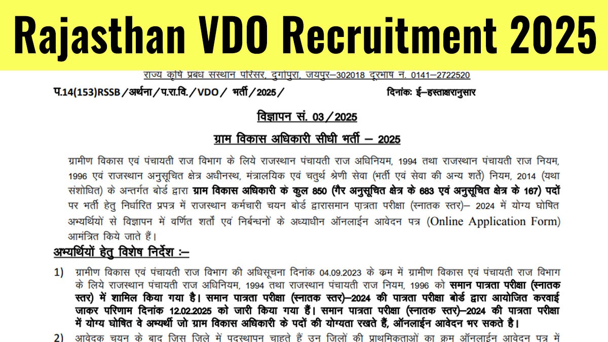 राजस्थान कर्मचारी चयन बोर्ड, जयपुर द्वारा ग्राम विकास अधिकारी (VDO) के 850 पदों पर भर्ती के लिए अधिसूचना जारी की गई है। यह भर्ती Rajasthan Panchayati Raj Act, 1994 एवं इससे संबंधित नियमों के अंतर्गत की जा रही है। इच्छुक एवं पात्र उम्मीदवार CET (Graduation Level) 2024 की पात्रता रखने पर इस पद हेतु ऑनलाइन आवेदन कर सकते हैं।