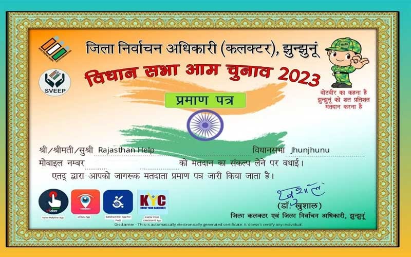 विधानसभा चुनाव के लिए नैतिक मतदान के संकल्प के साथ, आमजन जिला के चुनाव अधिकारी ई-प्रमाण पत्र के साथ हस्ताक्षर कर सकेंगे। इस अभियान की शुरुआत जिला निर्वाचन अधिकारी ने की है। उन्होंने इस अवसर पर बताया कि निर्वाचन कार्यालय ने तकनीकी साधनों का उपयोग करके इस पहल को लागू किया है, जिसके अनुसार कोई भी मतदाता विधानसभा चुनाव में अपनी मतदान की प्रतिज्ञा दे सकता है।